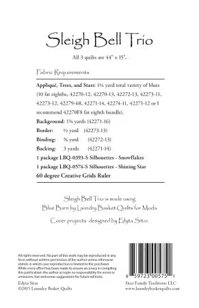Embrace the festive spirit with this charming Sleigh Bell Trio quilt pattern, perfect for adding a touch of winter magic to your home or as a thoughtful gift. This delightful set features three unique designs: the first with elegant snowflakes, the second with a classic sleigh gliding through a snowy landscape, and the third with a serene scene of snow-covered trees. Each quilt measures 44" x 15", making them ideal for wall hangings or table runners. Crafted with precision, the patterns require various fabrics including Appliqué Trees, Stars, and Snowflakes, ensuring a rich texture and depth to your finished piece.