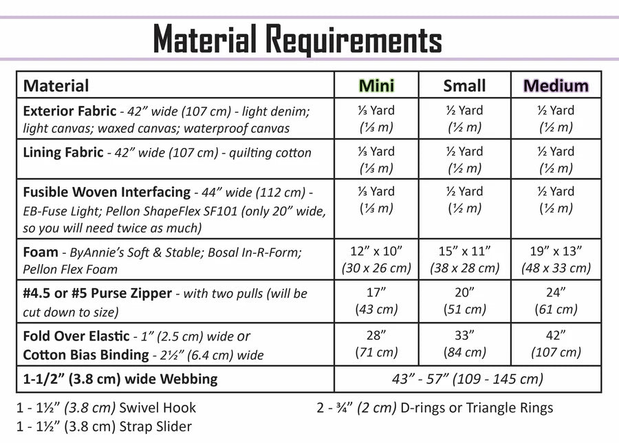 The pattern was designed for materials slightly heavier than quilting cotton, such as light canvas, light denim, soft vinyl, or waxed canvas and can be made on a domestic sewing machine! If you want to adapt it to cork, vinyl, or faux leather you will want to change up the interfacing and stabilizers to suit your chosen materials. And if you want to make it in quilting cotton you'll want to add some extra interfacing and stabilizers.